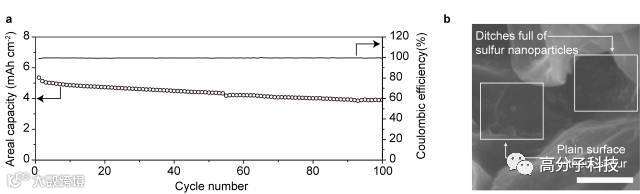 图2 高质量石墨烯微花-硫正极的电化学性能及循环后SEM图。