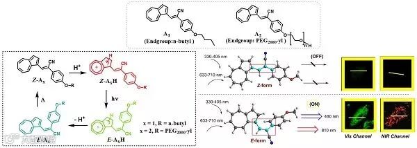 对于目前的研究来说,在有机和高分子光电材料中近红外技术的实现很大程度上依赖于大的π共轭体系,如何实现简单发色团的近红外能量和激发态调控是一个难点。复旦大学高分子科学系朱亮亮课题组着手开发氰基二苯乙烯嫁接的新型含薁的发光材料。它具有酸和光双重刺激响应调控构型和光物理性质;在聚乙二醇链的驱动下,不但能够因为生物相容性被细胞内吞,而且能够很好地保持高效率的可见-近红外双渠道发射性质,在通道选择性细胞成像方面显示了良好的优势。相关工作申请了发明专利(201610241333.2),相关论文近期发表在国际化学期刊Chem. Eur. J.上,详见DOI: 10.1002/chem.201700947