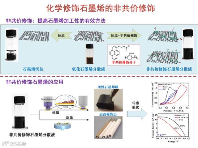团队经过多年的悉心灌溉,终于收获了创新的果实。团队创造性地提出了具有共轭结构小分子或高分子非共价修饰制备水溶性石墨烯的新方法。简而言之就是采用非共价修饰的方法在石墨烯的表面修饰一些基团,让它从不溶解的状态变成可溶的状态,同时保留石墨烯本身的性能和结构,并赋予它新的功能。这一新方法为发展和完善可溶性石墨烯制备技术提供了新思路。