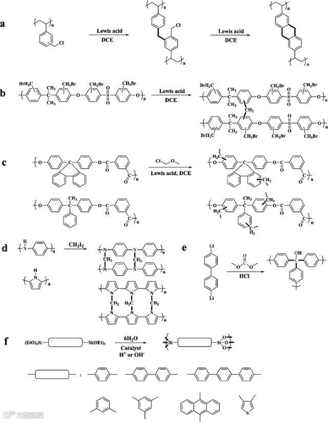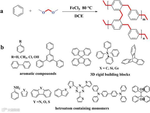 Tan及其同事提出了一种突破性方法,称为针织策略,其中使用具有相当活性的甲醛二甲基缩醛(FDA)作为外部交联剂,通过无水FeCl3催化的Friedel-Crafts反应,将简单芳族化合物如苯或联苯与刚性亚甲基桥键合(图5a)。例如苯,联苯,TPB,甲基苯,氯苯和苯酚等若干芳族结构单元(图5b),可直接编织合成具有主要微孔性和高表面积的网络。