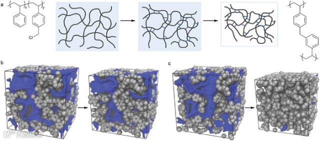 c. 由间苯二甲酸和两种双酚组成的聚芳酯前体直接用于制备超交联网络,使用氯甲醚(MCDE)作为交联剂(图2c)。