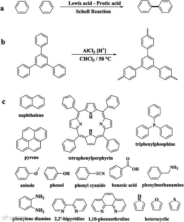 在成功制备这些聚合物之后,Tan及其同事提出了利用各种低功能性芳族结构单元合成微孔聚合物的方法,有效降低了成本(图4)。该方法基于直接连接相邻苯基的Scholl偶联反应,并在无水AlCl3催化剂下消除两个芳基结合的氢原子,形成新的双芳基键。