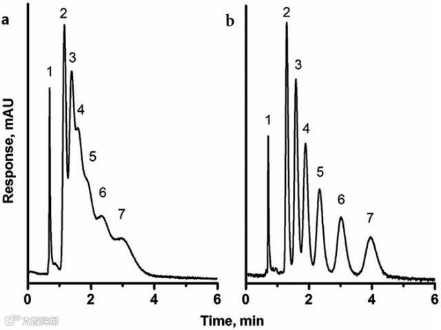 超交联单片毛细管柱的小孔阵列很适合高效等度分离。在过去几十年中,已经充分改善了毛细管柱对于各种小有机分子以及大生物分子的吸附效率,如烷基苯及其衍生物,尿嘧啶,蛋白质和磷酸肽。含有超交联物质的毛细管柱用作液相色谱的固定相,在丙酮和六种烷基苯的混合物的反相分离中,效率显著改善。