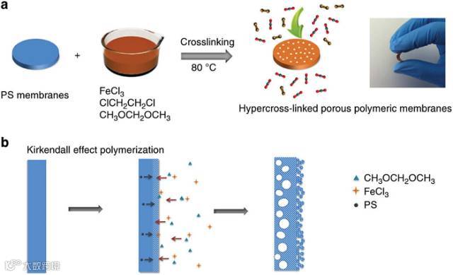 Dai等开发了一种合成聚合物分子筛膜的方法,简便且低成本。通过使用前体的简单涂布方法制造无孔PS膜,然后通过FDA超交联。编织过程如图8。所得针织聚合物膜为夹心多孔结构,其包括具有内部大孔核的致密孔层,和以小聚合物颗粒交联形成的外部中孔表面。