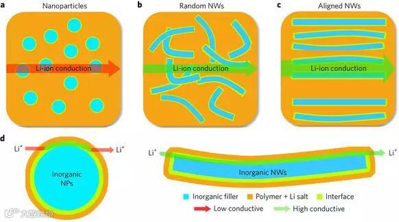 上海科技大学助理教授刘巍和斯坦福大学材料科学与工程学院教授崔屹等合作研究发现,将陶瓷纳米纤维掺入固体聚合物电解质是提高其电导率的有效方法。纳米纤维的表面是锂离子快速传导的通道,表面导电率可以和液体电解质相媲美。同随机分散排列的纳米纤维相比,有序排列的纳米纤维可以进一步将固体聚合物电解质电导率提高10倍。原因在于,定向排列的纳米纤维避免了无规则纳米纤维交叉产生的结点,从而锂离子可以无阻碍的在两个电极之间传导。此外,掺入陶瓷纳米纤维后,固体聚合物的化学稳定性也获得大幅提高。