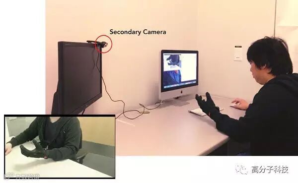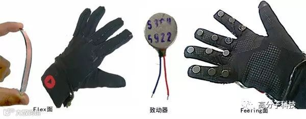 研究初期,为保证交互式触觉的可行性,研究者将目标先锁定于手套,并将手套的正反面分别设计,一面叫做“flex”,用于实现弯曲握持的动作;一面叫做“feel”,用于模拟皮肤触感。在手腕处有红色按钮开关,接受利用WiFi方式传达的动作信号。