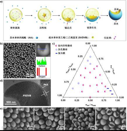 (a) 乳液界面聚合机理。 (b) 低倍扫描电子显微镜结果表明合成的月牙结构的微球具有良好的尺寸均一性(左侧)。同时,元素分析结果表明微球具有两面性质(右侧),相比于疏水性的聚苯乙烯-聚二乙烯基苯(PSDVB),O元素仅存在于聚丙烯酸(PAA)上,因此,证明微球凹面为疏水性的PSDVB,凸面为亲水性的PAA;(c) 三元相图显示出各向异性微球的形成条件为:nSt / ntotal < 0.625, nDVB / ntotal < 0.625 and nAA / ntotal < 0.75;(d) 月牙结构微球经超薄切片后的透射电子显微镜图,PAA层的厚度为53 ± 20 nm;(e) 通过调节亲疏水性单体组成比例,可实现各向异性微球的可控合成。同时,微球表面的化学各向异性,包括表面电荷、两亲性也随着微球形貌的改变而发生变化。