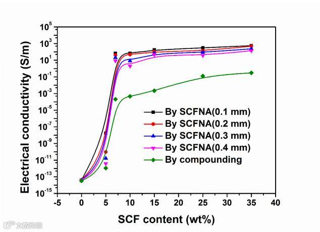 通过制备方法的创新,实现了用“强制组装”方法替代目前“自组装”方法构建网络的重要突破,相同配方条件下,采用SCFNA法制备的聚丙烯-碳纤维复合材料导电性能高出2-4个数量级。制备的聚二甲基硅氧烷-碳纤维复合材料导电性能提高1-5个数量级。同时,获得了聚合物基复合材料关于强制组装厚度上的导电渗流现象。相关研究得到业内同行的高度关注,有望较大程度地推进聚合物基导电导热复合材料技术的进步。同时对于开辟注射机与螺杆挤出机新功能具有重大的工程实用价值。