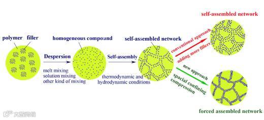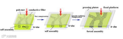 为解决上述问题,应该探索能够有效减小导电网络上粒子间平均间距的新加工方法。北京化工大学塑料机械研究所所长吴大鸣教授团队提出了一种空间限域强制组装法(SCFNA)制备导电导热复合材料的新方法,其实质是在限制自组装网络摆动自由度的条件下,对松散的自组装网络进行强制压缩组装。从而对功能分散相施加远大于自组装作用力的“强制组装力”,强制“挤走”导电粒子间的聚合物,实现了导电网络的密实化,为大幅度提高导电性能提供了可能性。在填料含量不变的前提下,复合材料的电导率成数倍甚至成数量级的提高。同时复合材料的导热性能也获得了数十倍提高。该方法目前在热塑性复合材料,热固性复合材料及光固化复合材料均获得显著效果。相关成果发表在国际知名复合材料期刊Composites Part A。