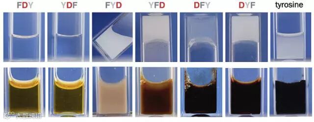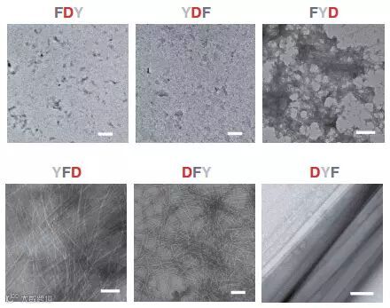 有意思的是,三肽中酪氨酸残基之间的非共价相互作用会随着三肽氨基酸序列的改变而改变,因而自组装所得的超分子结构也有区别。例如,FDY和YDF这两种三肽会自组装成可溶的聚集体,FYD是无定形聚集体,YFD和DFY是纳米纤维,而DYF则是晶体。