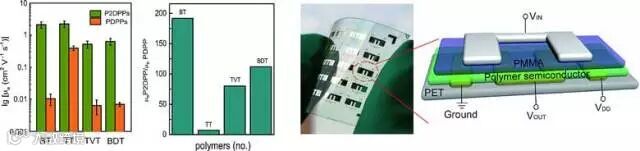 经典的DPP类材料以p型材料居多,主要归因于该类材料具有较高的LUMO能级,不利于电子的注入。通过受体二聚策略合成的2DPP类聚合物材料,LUMO能级比DPP类聚合物的降低了0.1 eV,从而降低了电子的注入势垒,使得2DPP类聚合物的电子迁移率得到了显著的提升。其中P2DPP-BT相比PDPP-BT电子迁移率提升了180倍,由此证明受体二聚策略在改善材料电子迁移率方面具有良好的应用价值。为了充分发挥有机半导体材料的柔性优势,OFET器件采用塑料基底,制备了可弯曲的柔性晶体管。基于P2DPP-TT构筑的柔性晶体管空穴和电子迁移率分别高达4.16和3.01 cm2•V–1•s–1,达到目前柔性双极性晶体管的最好性能。在塑料基底上,基于P2DPP-TT构筑的反相器增益高达70,证明2DPP类材料将在柔性有机电路中具有较好的应用前景。
