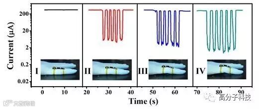 图3 传感器监测手指活动的电流响应曲线。插图分别为手指弯曲I、II、III、IV四个状态的照片。