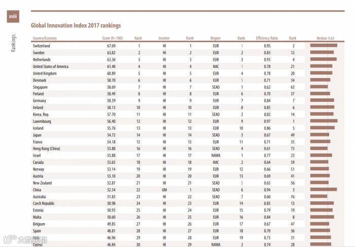 2017年全球创新指数由康奈尔大学、英士国际商学院和世界知识产权组织共同发布。每年全球创新指数使用从专利申请量到教育支出等数十种指标,对大约130个经济体进行调查。全球创新指数自2007年起每年发布,现已成为首要的基准工具,为全球范围内的企业高管、政策制定者以及其他在创新方面寻求创见的人员所使用。