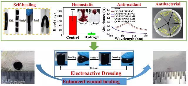 以上研究结果以论文形式发表在国际知名期刊Biomaterials (影响因子8.387)上,论文题目为“Antibacterial anti-oxidant electroactive injectable hydrogel as self-healing wound dressing with hemostasis and adhesiveness for cutaneous wound healing”。 西安交大前沿院博士生赵鑫与西安交大医学部博士生武浩为本论文的共同第一作者,西安交大前沿院为本文的第一作者单位和通讯作者单位。