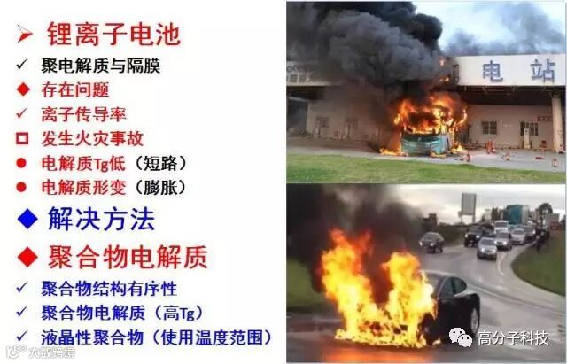 随着能源危机与环境保护的双重压力,锂离子电池应用市场规模得到了迅猛扩张,但也存在着一些安全隐患,时有报道手机、汽车等爆炸等危险事故。由于在锂离子电池中使用的电解质是液体电解液,受热易膨胀,造成电解液泄露,高温时电解液还可能燃烧。因此人们开始研究固态聚电解质。