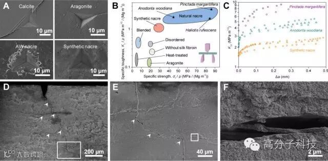图三: 人工珍珠层与天然珍珠层力学性质的比较和分析 (A)纳米压痕实验表明微观尺度上天然珍珠层和人工珍珠层都有很好的抗裂纹能力;(B)阿什比图表明人工珍珠层具有良好的力学性能;(C)人工珍珠层的断裂韧性随裂纹扩张呈上升趋势,证明有非本征增韧机理;(D)开口样品的三点弯曲实验显示出裂纹的折射和沿层间扩展;(E)(D)图中标识区域的放大结构;