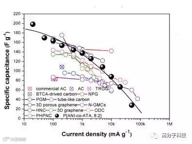近日,天津大学材料学院封伟教授课题组硕士研究生高毅等人独辟蹊径,创新地将新型纳米导电聚合物作为正极材料引入到HSC储能体系中,为HSC正极材料的研发提供了新的解决方案。研究人员采用化学氧化法将苯胺与2-氨基对苯二甲酸共聚,通过调整两种单体的比例获得了具有不同微观形貌和电化学性能的共聚物材料。研究发现聚苯胺分子链上的羧基能够增强主链上电子的离域效应,同时提高了分子链间的相互作用力,从而使得材料的电化学性能得到极大改善。另一方面,特殊的一维纳米结构也有助于材料电化学性能的进一步提升。在半电池测试中,这种材料的最大放电电流达到50A/g,电化学性能优于目前报道的绝大多数碳基材料。以该材料为正极,中间相碳微球为负极组成的HSC储能器件的能量密度达到153.9 Wh/kg,换用钛酸锂作为负极材料,在26.1 Wh/kg的能量密度下相应的储能器件的功率密度达到了3011.5 W/kg,其能量密度和功率密度与目前报道的电池和电容器的性能相当。在未来的研究计划中,科研人员设想将这种材料与其他无机材料进行复合,其性能将会有巨大的提升空间。
