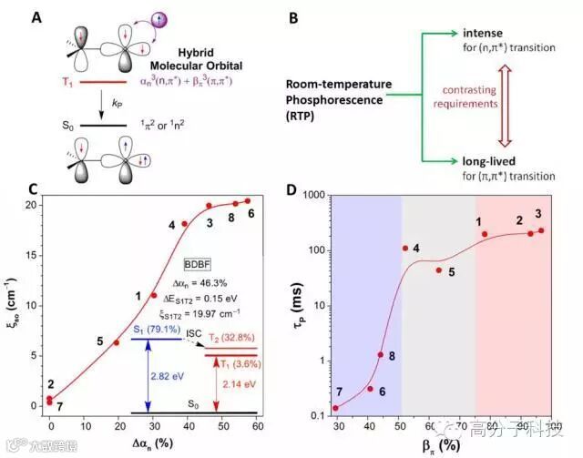 图1, A,三线态跃迁的分子轨道理论模型。B,RTP分子设计要素。C,不同分子结构的分子旋轨耦合常数(xSO)与分子三线态跃迁时 3(n, p*)所占比例 (an)变化量的关系。D,不同分子测得的实验寿命与理论计算的分子第一三线态中3(p, p*)所占比例(bp)的关系。