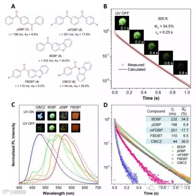 图2,A, 分子结构及其相应的磷光寿命和效率。B,BDBF分子的磷光衰减曲线及照片。 C,化合物稳态光谱及磷光光谱。D,化合物磷光衰减曲线。