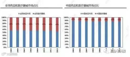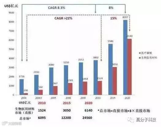 按国际惯例,医用生物材料的管理划属医疗器械范畴,所占医疗器械市场份额>40%。作为高技术重要组成部分的生物医用材料已经进入1个快速发展的新阶段,其市场销售额正以每年16%的速度递增,预计在未来20年内,生物医用材料所占的份额将赶上药物市场,成为1个支柱产业。