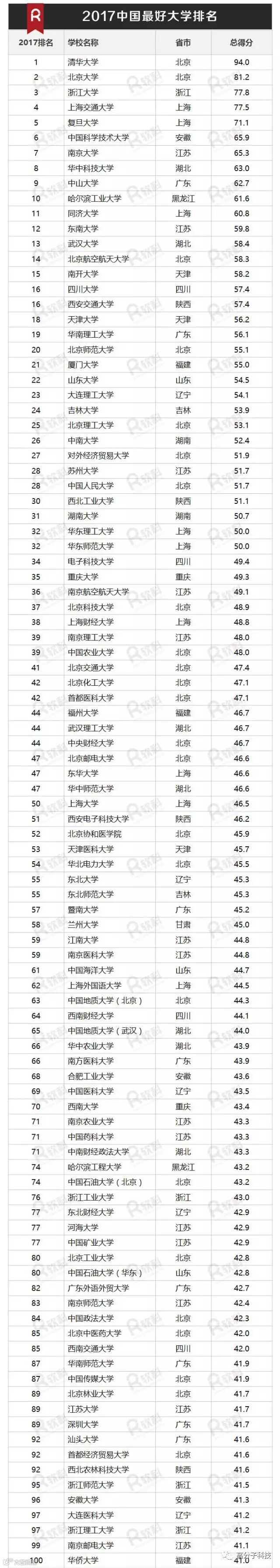2017年2月27日软科发布2017“中国最好大学排名”。排名展示了中国综合实力最强的500所大学,清华大学、北京大学、浙江大学位列前三,上海交通大学、复旦大学、中国科学技术大学、南京大学、华中科技大学、中山大学、哈尔滨工业大学依次排在4-10名。地方高校中表现最好的是苏州大学(28名)、首都医科大学(42名)、福州大学(44名)和上海大学(50名)。