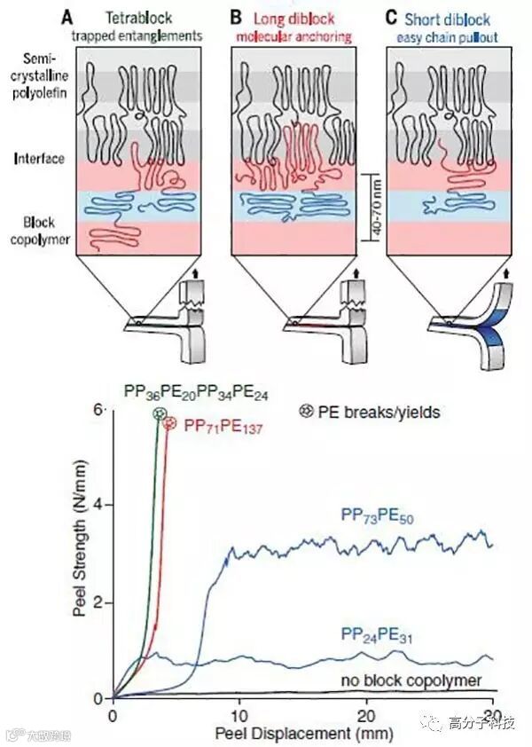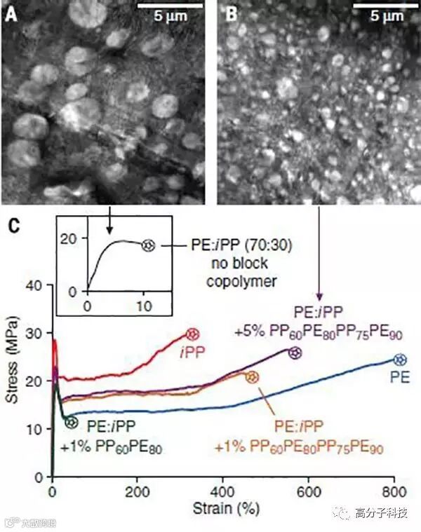 PE和iPP作为最常用的两种塑料产生了大量的废物流,在回收利用上,由于两种塑料不能混合,降低了回收价值。本文作者通过利用聚合物引发剂合成了PE和iPP的多嵌段共聚物。这种高分子块可以强化PE和iPP界面,使其有效混合,提升废品回收价值。