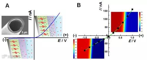 离子电流整流是一种物理现象,指的是在相同的电压驱动下,正向和逆向的离子电流大小不同,这种不同主要由生物或纳米结构离子通道中阴阳离子的不对称传输所引起。近年来,离子电流整流因其不仅具有重要的理论研究意义,而且在生物电化学传感器、流体逻辑电路、纳米离子学等领域中也具有潜在应用价值,而受到广泛的关注。但是,绝大部分的整流现象是在纳米尺度的体系中被观察到的,当孔的直径大于Debye长度的10倍时,很难观察到整流现象。而在微米尺度上的整流更是鲜见报道。