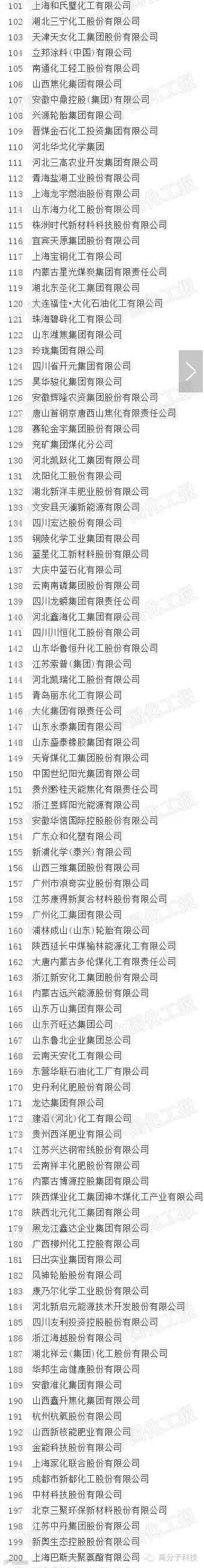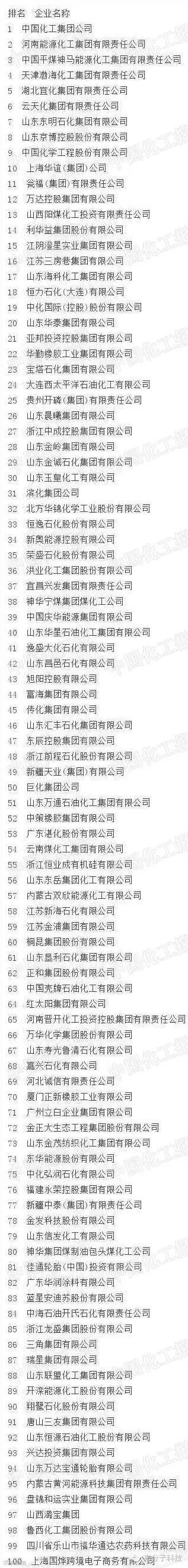 排在榜单前十名的企业分别为中国化工集团公司、河南能源化工集团有限责任公司、中国平煤神马能源化工集团有限责任公司、天津渤海化工集团有限责任公司、湖北宜化集团有限责任公司、云天化集团有限责任公司、山东东明石化集团有限公司、山东京博控股股份有限公司、中国化学工程股份有限公司、上海华谊(集团)公司。