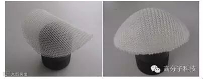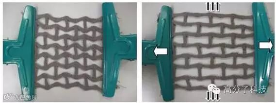 通过对织物组织的设计和后整理措施,使六角网眼发生有序的左右歪斜,在充分收缩的前提下进行定形整理,使其变形更加稳定,持续性更久。在受到拉伸时,与常规状态下的六角网眼经编间隔织物就呈现出截然相反的变形。目前已研究出的经编间隔织物不仅在织物平面内具有拉胀性能,在织物厚度方向同样具备该性能,与常规间隔织物相比,它还具有更好的球面贴合性。