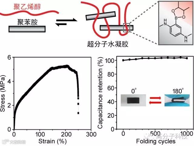 针对这一目标,马明明课题组运用超分子结构设计的原理,用硼酸酯键将刚性的聚苯胺和柔性的聚乙烯醇在分子水平上进行自组装,形成具有三维动态网络结构的高强度电活性超分子水凝胶。该水凝胶的拉伸强度达到5.3 MPa,断裂伸长率达到250%,在0.5 A/g的电流密度下,比电容值达到928 F/g,1000次充放电后的比电容保持率达到90%。该水凝胶的力学性能、电化学活性和稳定性均大幅度超过现有的电活性水凝胶。将该水凝胶作为电极材料组装成柔性全固态超级电容器,在0.25 A/g的电流密度下实现了153 F/g的比容量,1000次折叠后的比电容保持率达到100%,室温存放7周后的比电容保持率达到93%。这一工作为设计新型柔性能量存储器件提供了新思路。