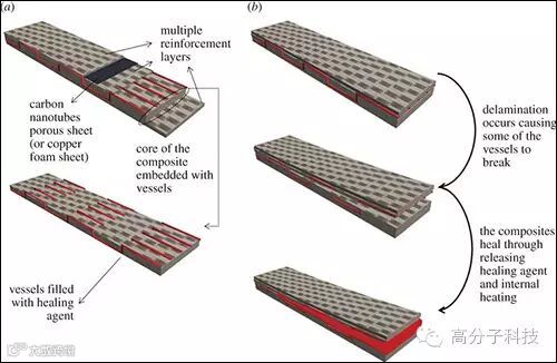 然而,直到此论文发表,在不利条件下的愈合都被认为是不足的,例如在非常低的温度下。这种新结构复合材料保持其核心温度,就像自然界的一些动物靠保持恒定的体温以保持酶的活性。以递送和释放愈合剂为目的的三维中空容器与提供内部加热和解冻的多孔导电元件一起,被嵌入在复合材料中。