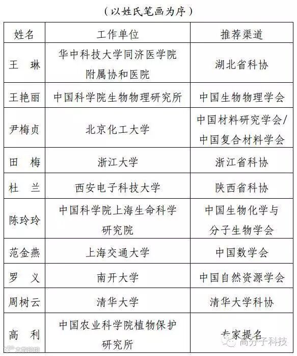 本届中国青年女科学家奖获奖名单如下