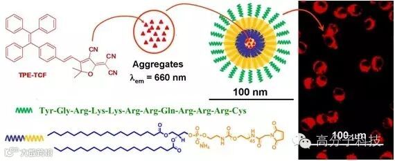 本文通过简单高效的方法合成了具有红光发光性能的小分子。经研究,该分子具有聚集诱导发光性能及溶致变色性能,并且具有较高的固态量子效率。通过利用两亲性聚合物包裹的方法,我们得到了以该分子为核,外围修饰穿膜肽的有机红光纳米粒子。细胞成像结果表明,该纳米粒子可以对细胞质进行染色,且在triton处理下,它具有与常用的细胞核染料DAPI相似的染色性能。