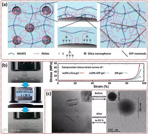 图2. 纳米复合双网络水凝胶的(a)网络结构,(b)力学性能,(c)压缩前后的透射电子显微镜照片对比