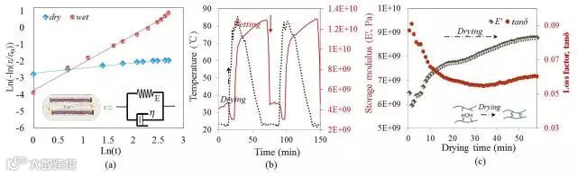 (图a: 拉伸毛纤维在干燥和湿润环境中动态回复速率的比较;图b和c:DMA下测得毛纤维储存模量和损耗系数在干湿状态下的转变)