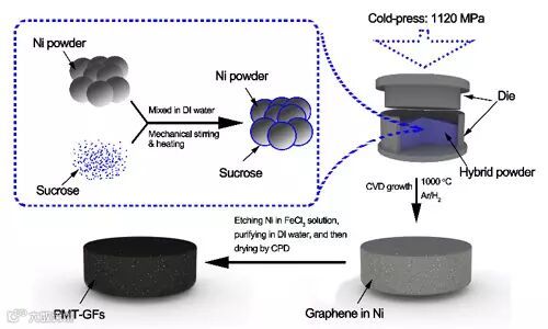 图:通过传统的粉末冶金与化学气相沉积相结合,获得三维石墨烯的基本过程。