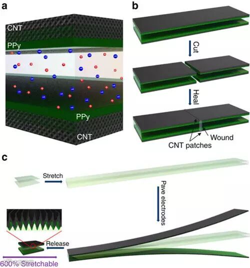 清华大学化工系博士生钟鸣为论文共同第一作者,清华大学化工系谢续明教授和香港城市大学物理与材料科学系支春义助理教授为共同通讯作者。所制备的柔性超级电容器可以拉伸6倍,卸载后完全回复;且切断后重新对接可以完全自修复,性能得以完整保持。该柔性器件作为电子可穿戴物、电子皮肤等具有重要潜在应用。