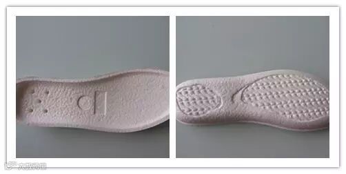 TPU发泡珠粒可以通过水蒸气成型机来实现模压成型,制备ETPU鞋材中底以及其他成型体材料。2013年12月以来,研究团队联合水蒸气成型机生产商对现有成型机设备进行改造,联合模具厂进行鞋材模具设计,先后解决了模框/模具设计与安装、发泡珠粒稳定注入、模具轧花工艺设计、模具排气效果设计等多个难题,实现了ETPU成型体材料的收缩率控制、多种复杂轧花效果的实现,同时有效地避免了成型材料表面缺陷的产生。如图3所示,所开发的ETPU成型体材料可以具有复杂的表面结构和实现了精细的印纹效果。性能测试表明,ETPU成型材料的密度为0.18-0.30g/cm3可控,硬度为邵C35-60度可控,C型撕裂强度为15-30kgf/cm2,回弹率为50-60%,50度压缩永久变形小于30%,NBS耐磨为200%以下,黄变可达3.5级以上,上述性能完美地满足了跑鞋鞋材回弹率高、压缩永久形变低的需求。