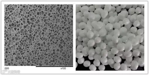 图1. TPU发泡珠粒和发泡珠粒泡孔结构电镜照片