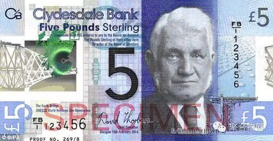 钞票正面有福斯大桥以及苏格兰工程师威廉·阿罗尔爵士的肖像,其公司曾负责大桥的建造工程。