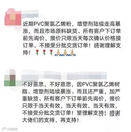 整体来看,现货市场货源不多,贸易商心态也是惜售为主,导致PVC报价继续调涨。随着PVC爆发性的涨价,对于下游工厂而言,就真的是有苦难言了,大呼“生意没法做” !