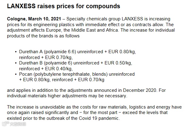 保根(PBT)非增强材料每公斤上调0.8欧元,增强材料每公斤上调0.7欧元。