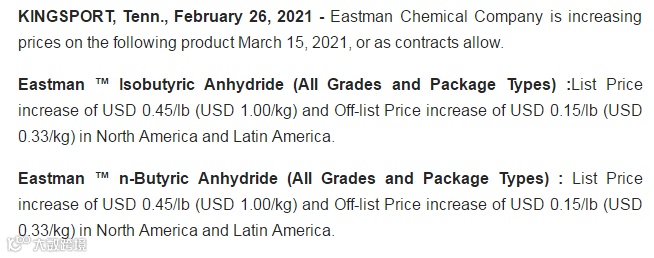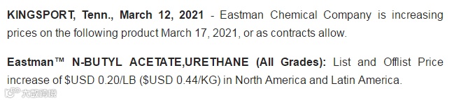 伊士曼化工(Eastman Chemical)的涨价主要针对北美和拉美地区,并且标价及非标价均上调,从3月17日起,将伊士曼™ N-BUTYL醋酸盐及氨基甲酸乙酯(所有牌号)每公斤上调0.44美元;从4月1日起或根据合同执行,Eastman NPG™(Molten)及Eastman NPG™ 90每公斤均上调0.6美元。
