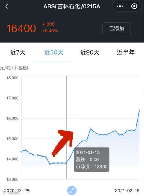 另外一边,ABS/吉林石化/0215A,从1月13日的13800元/吨,一路上涨至2月19日的16400元/吨,上涨2600元,涨幅18.84%,也是强势豪横之辈。
