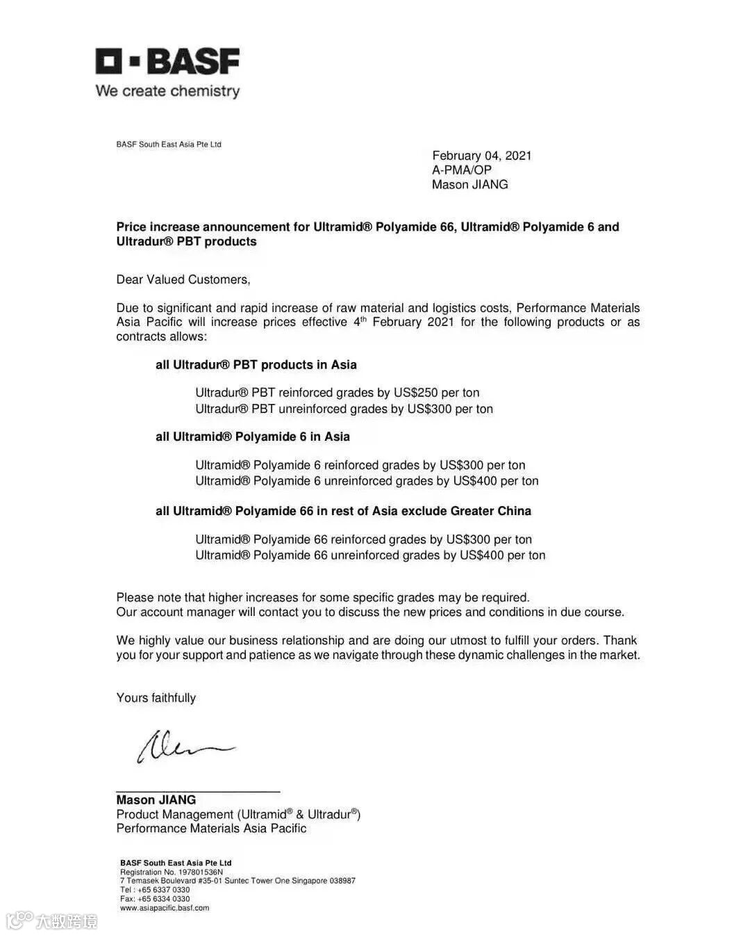 巴斯夫发布涨价函,由于原材料和物流成本快速增长,现将在亚太地区进行如下产品相关价格上涨: