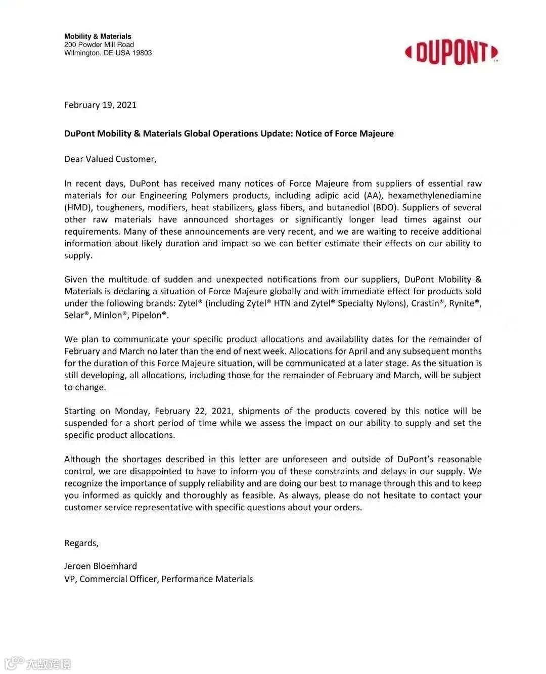 杜邦发函称,鉴于供应商的大量突发和意外通知,杜邦移动与材料公司宣布在全球范围内发生不可抗力情况,并立即影响以下品牌的产品:Zytel“(包括Zytel* HTN和Zytel“特种尼龙),Crastin*,Rynite*,Selar, MinlonR,Pipelon。由于情况仍在发展,所有的拨款,包括2月和3月剩余时间的拨款,将会有所改变。从2021年2月22日(周一)开始,本通知涵盖的产品的发货将暂停一段时间。