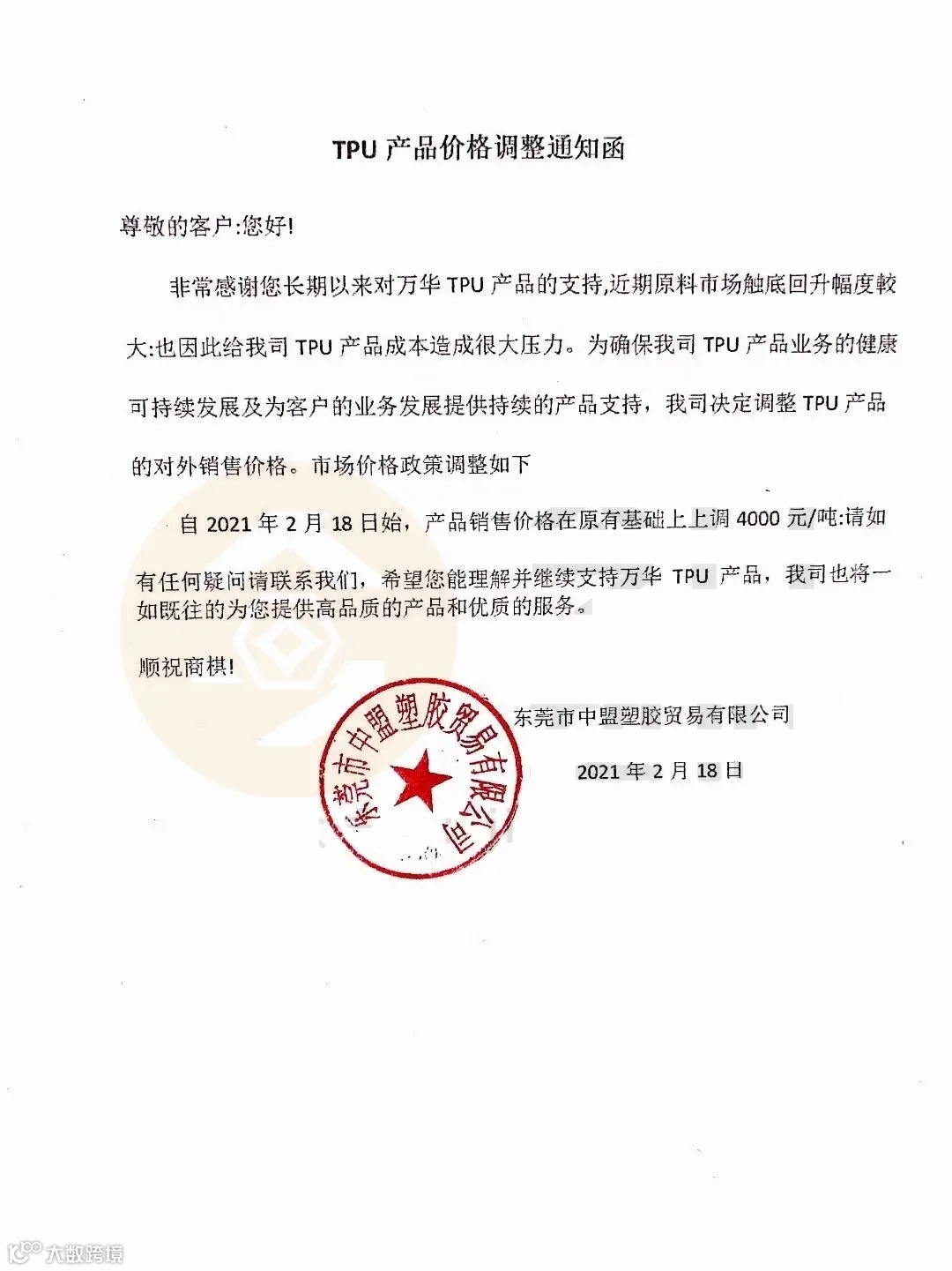 东莞市中盟塑胶发布TPU涨价函,称2月18日起,产品销售价格在原基础上上调4000元/吨。