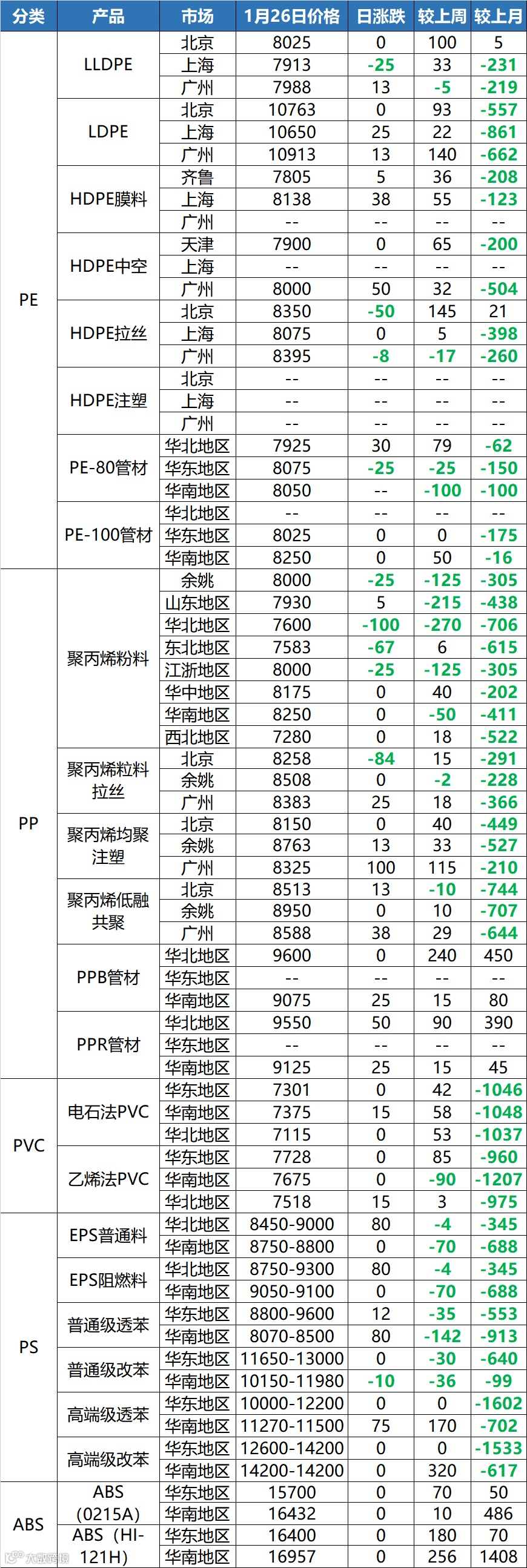 HDPE中空广州市场月跌504元;LDPE上海市场月跌861元;PP粉料华北地区月跌706元;PP低融共聚北京市场月跌744元;PVC就更惨了,华南地区电石法月跌1048元、乙烯法月跌1207元;华东地区,PS高端透苯月跌1602元,高端级改苯月跌1533元,所有塑料在挨揍,只有ABS还在秀,ABS/宁波LG甬兴/HI-121H月涨1408元/吨,不得不说老大哥还是老大哥!(单位:元/吨)