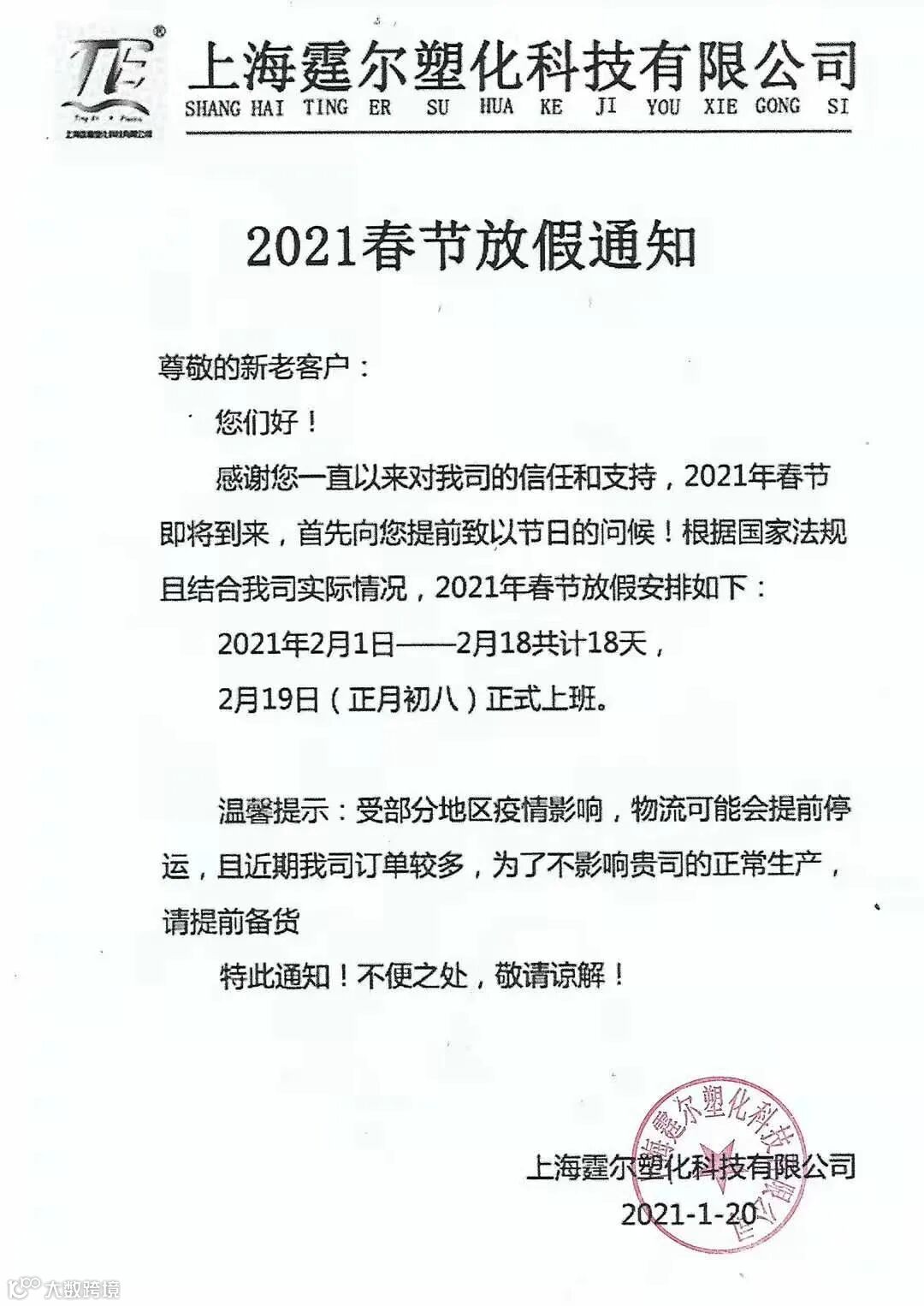 1、上海霆尔塑化科技发函称,2月1日起正式放假,2月19日正式上班,受部分地区疫情影响,物流可能会提前停运,请提前备货。