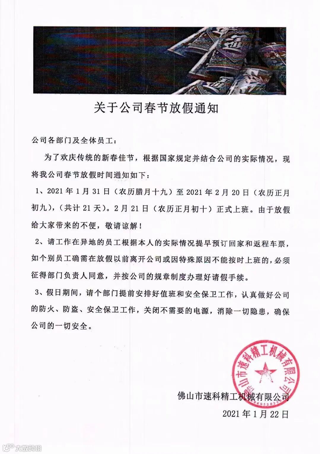 2、佛山市速科精工机械发函称,1月31日至2月20日春节放假(共计21天)2月21日(农历正月初十)正式上班,由于放假带来的不便敬请谅解。
